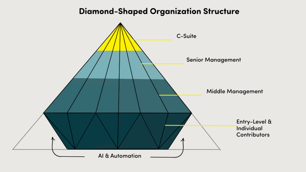 Against this backdrop, organizations are beginning to move away from traditional pyramid structures toward what experts call diamond-shaped organizations. These models emerge when automation reduces the
